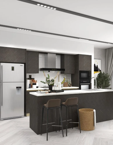 A minimalist design that features a single counter running along one wall. It is a popular choice for smaller kitchens and apartments due to its compact design.