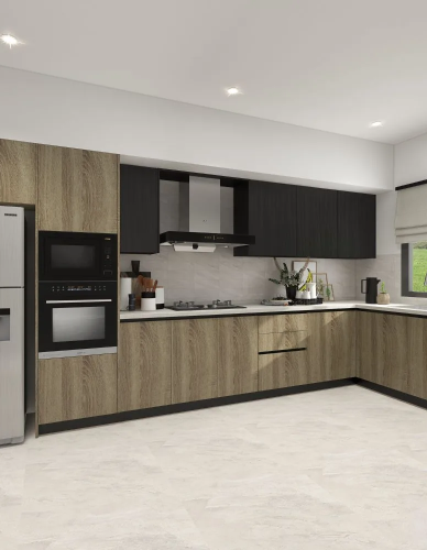Wet kitchens use durable, water- and heat-resistant materials like granite, stainless steel, and tiles to withstand heavy cooking. Dry kitchens, used for light prep and serving, allow for more decorative finishes like wood laminates, glass panels, and engineered stone for a stylish look.